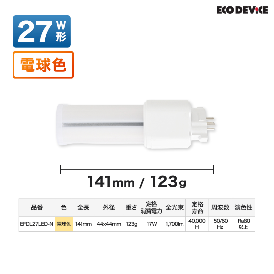 27形 電球色 LEDランプ コンパクト型 FDL 3000K 17W 1,200lm 44×44×141mm 123g