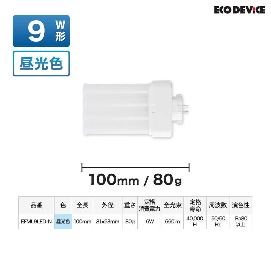 9形 昼光色 LEDランプ コンパクト型 FML 5700K 6W 660lm 81×23×100mm 80g