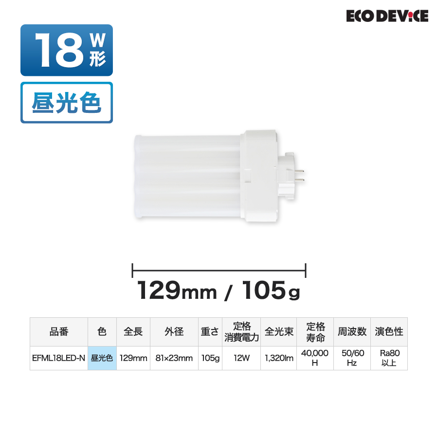 18形 昼光色 LEDランプ コンパクト型 FML 5700K 12W 1320lm 81×23×129mm 105g
